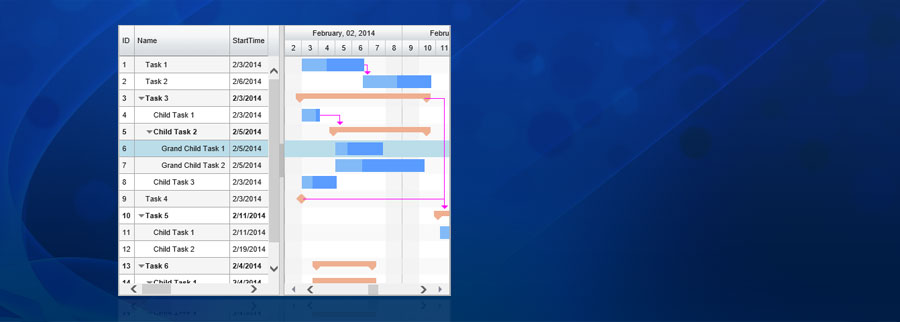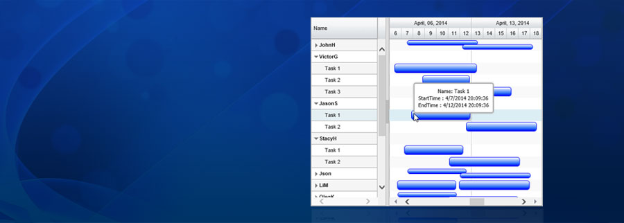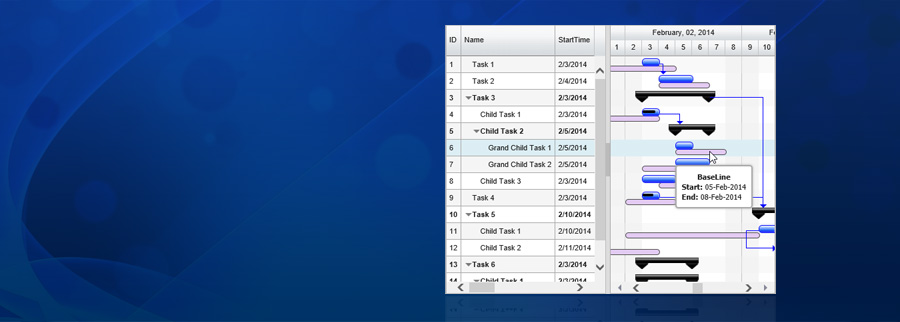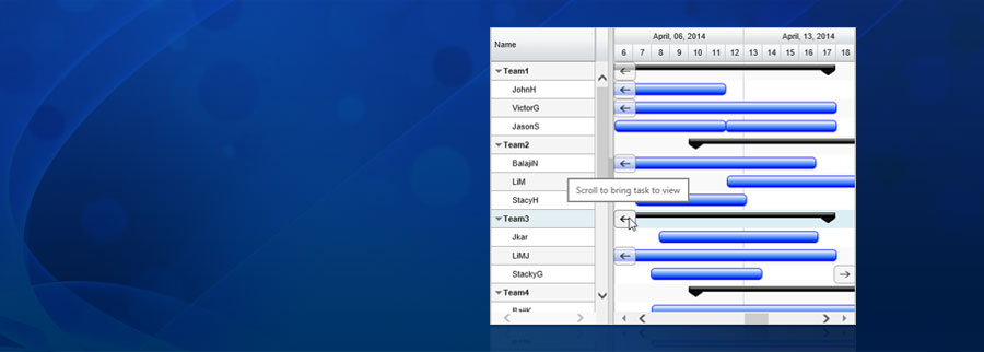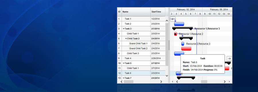 • Feature Rich, Editable, Hierarchical Task List visualization in an API rich Grid View.